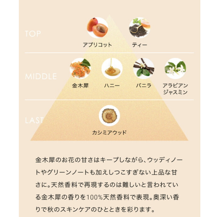 天然香料で再現するのは難しいといわれている金木犀の香りを100%天然香料で表現しています。