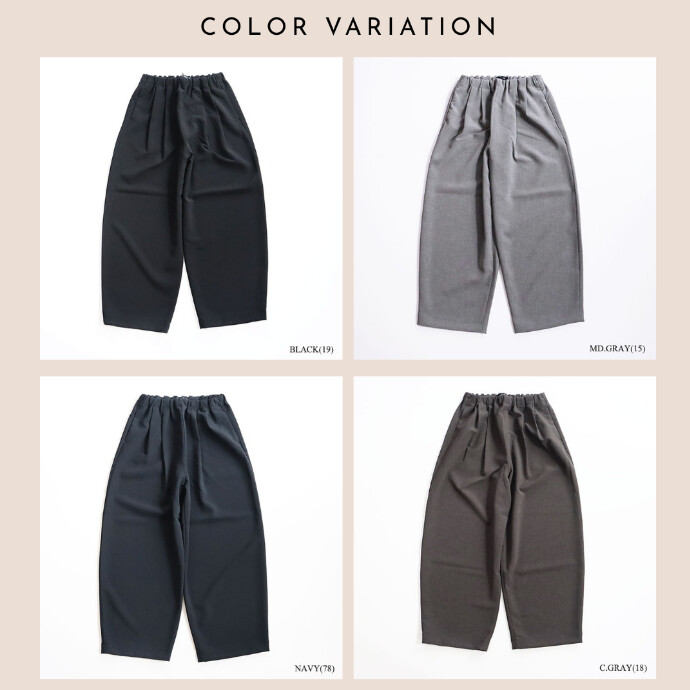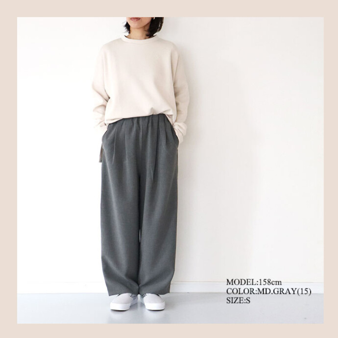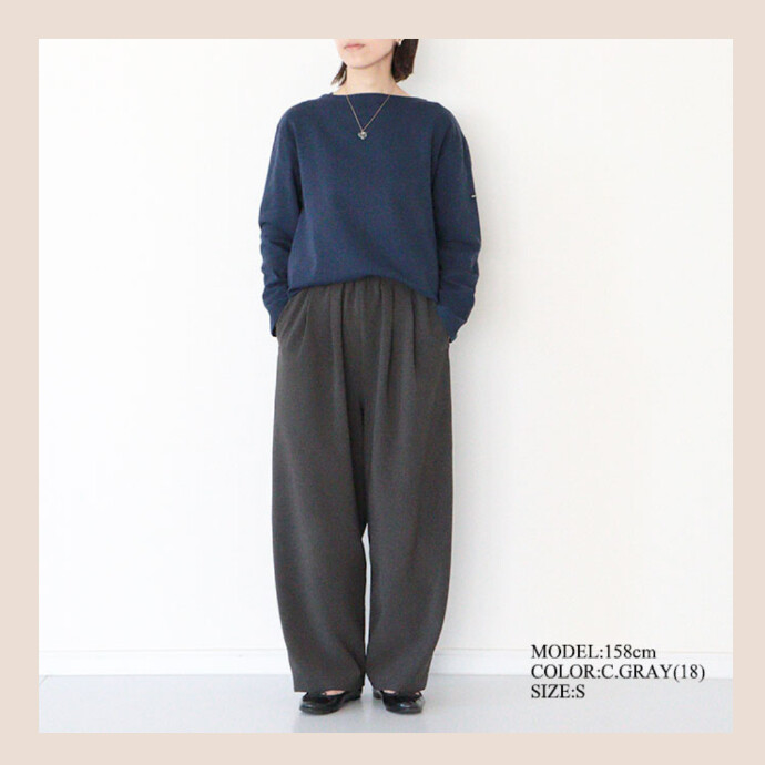 ワイドパンツでありながら裾の分量を抑えたコクーンシルエットは