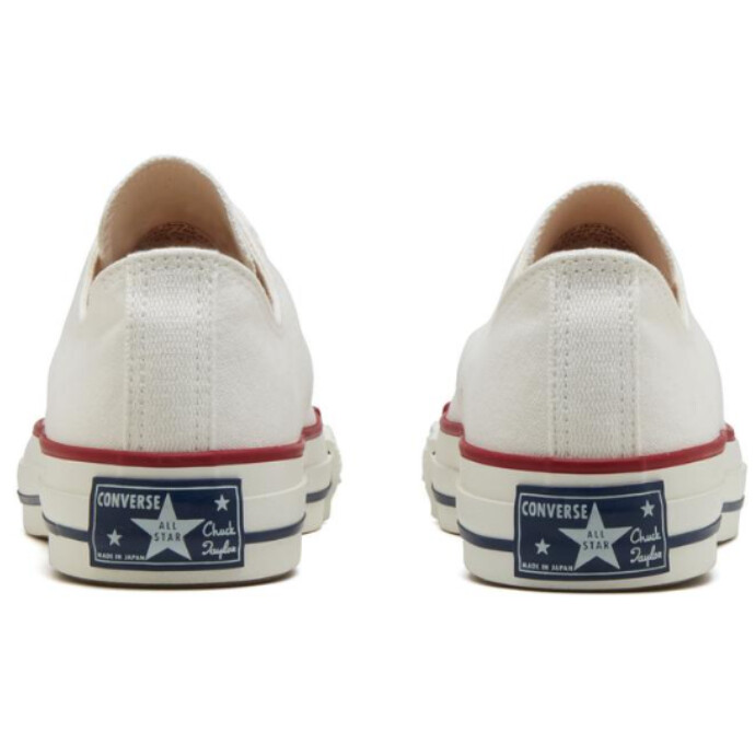 当時を復刻したデザインのサイドステッチと当て布、斜めに三ツ星が配置されたヒールラベル、右足のタン裏のレトロなプレイヤーズネーム、日本の国旗をイメージして生成りのキャンバスに赤字で印されたコンバースロゴなど、新たなオールスターの歴史を感じることのできるアイテムになっています