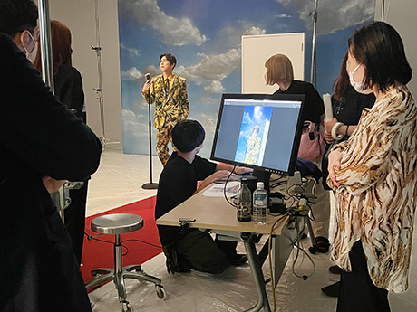 爽やかな青空をバックに、鮮やかなスーツを身にまとった梶さん。