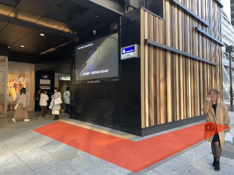 地下鉄連絡通路の出入り口と御堂筋に面しています。