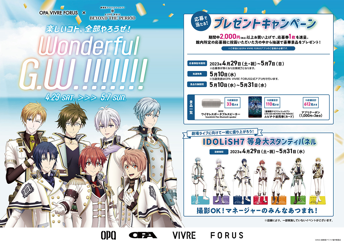 ※大分オーパでは、「応募で当たる!プレゼントキャンペーン」は実施しておりません。 ※聖蹟桜ヶ丘オーパ・明石ビブレでは、「iDORISH7等身大スタンディパネル」の設置はございません。