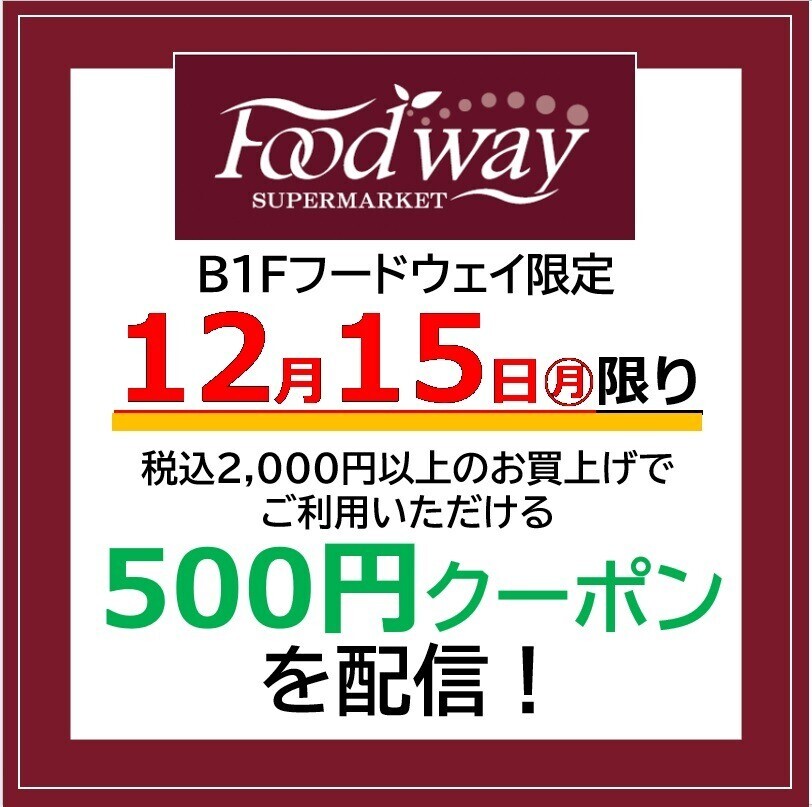 12月15日(月)に、地下1階のスーパーマーケット「Foodway」にて、税込2,000円以上のお買上げでご利用いただける500円クーポンが配信されます。