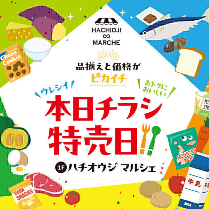 1F食品『ハチオウジマルシェ』 チラシ特売日情報! ※チラシ表示価格は本体価格と税込価格です。 ※複数お買い上げの際、お支払額が異なる場合がございます。 ※チラシ商品は豊富に取り揃えておりますが、万一品切れの際はご容赦ください。 ※チラシ内容は予告なく変更になる場合がございます。 ※掲載写真・イラストはすべてイメージです。