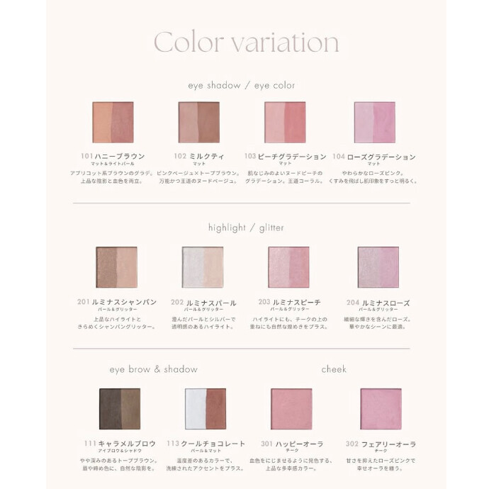 🤎 101 ハニーブラウン(マット&ライトパール):アプリコット系ブラウンのグラデ。上品な陰影と血色を両立。