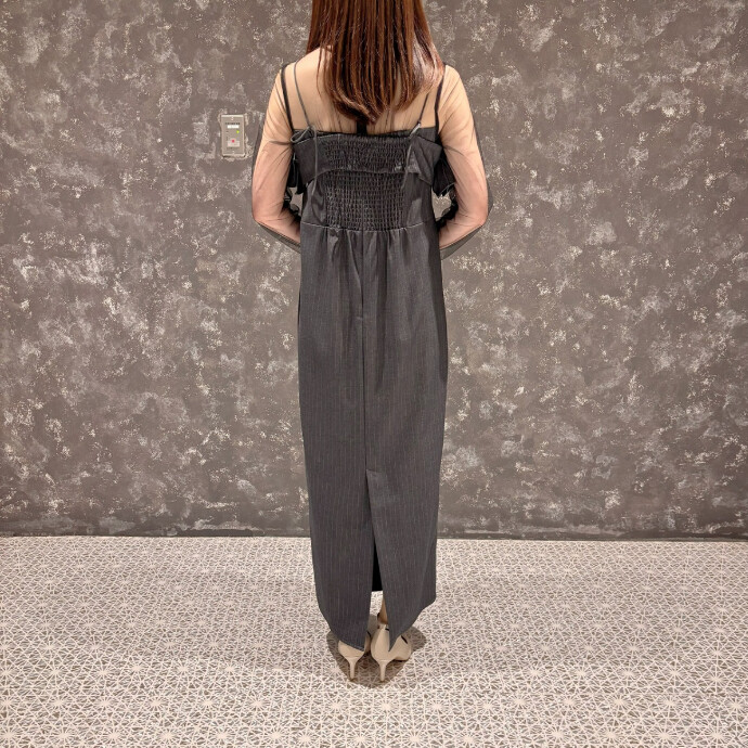ドレスではめずらしいストライプ柄の生地を使用しているので、さりげなくシャープに見せてくれますよ