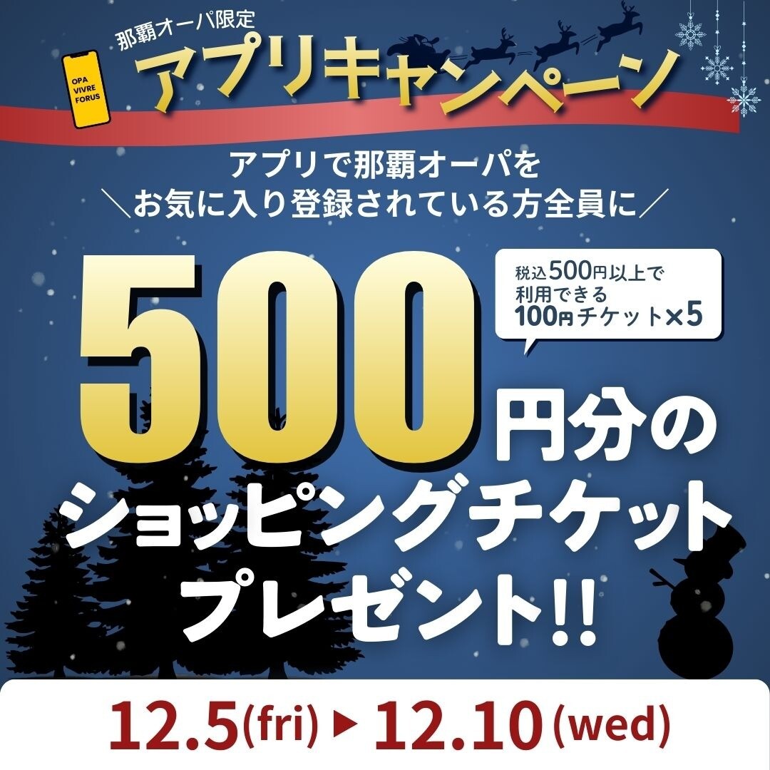 🌨️ --------------------------------------- ❄️ 那覇オーパ アプリフェア ショッピングチケットプレゼント! 12/5㊎~12/10㊌ 🎄 --------------------------------------- ⛄ OPA VIVRE FORUS アプリにて那覇オーパを「よく利用する店舗」へ登録いただいている方へもれなく合計500円分のショッピングチケットをプレゼント!■税込500円ごとに利用できる100円チケット ×5枚【チケット配信日】2025年12月5日(金)【利用期限】2025年12月5日(金)~12月10日(水)12/5(金)~12/10(水)の期間に新規登録された方もチケット配信されます!ぜひこの機会にアプリダウンロード&那覇オーパへご登録ください!アプリのダウンロードはこちらから↓https://www.opa-club.com/contents/app/※ショッピングチケットの配布は一度のみです。※ジョイジャングル、ドリームカプセル、バナナレンタカー、エクシア、期間限定ショップはキャンペーン対象外となります。※那覇オーパをお気に入り店舗に登録されていないとショッピングチケットが配信されませんのでご注意ください。※利用期限を過ぎますとショッピングチケットはアプリより削除されます。※ご利用には条件がありますのでご注意下さい。