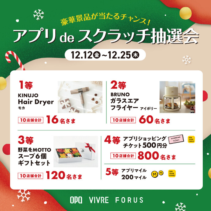 12月12日(金)~12月25日(木)の期間中、OPA VIVRE FORUSアプリご提示の上、税込3,000円(合算可)以上お買上げで、スクラッチ抽選に1回チャレンジ!