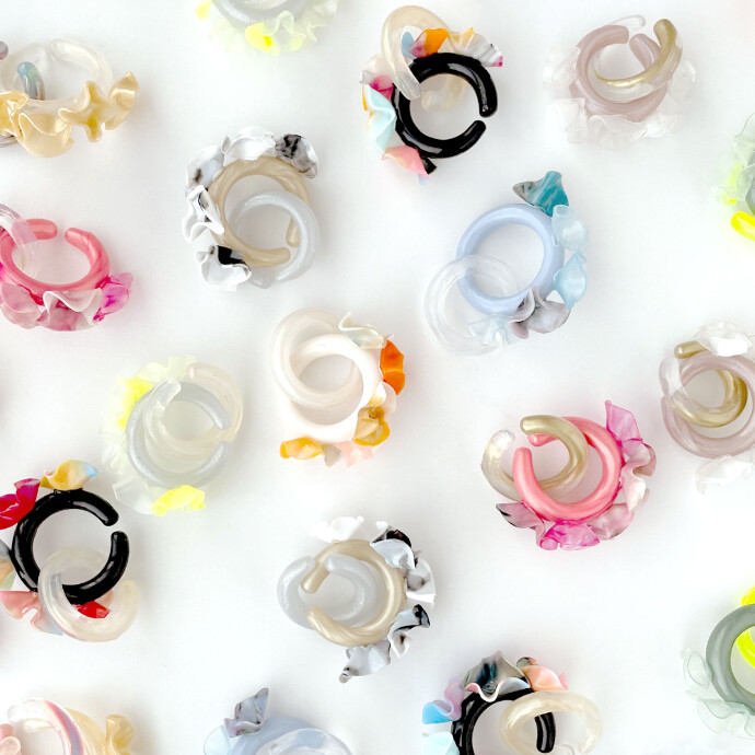 パステル調やビビットカラー、またダークで落ち着いた色などの無限の配色の中から生み出された軽やかなアクセサリー。