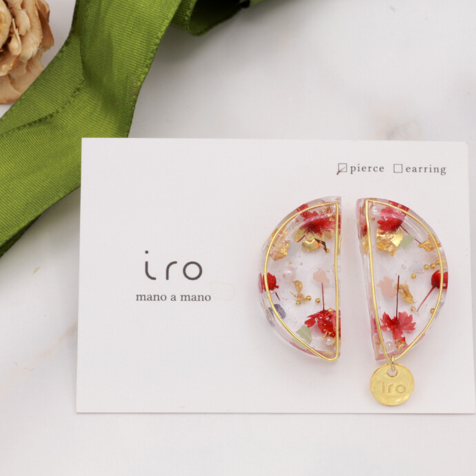レジンにドライフラワーやビジュー、淡水パールや金箔などを散りばめたフェミニンアクセサリーです。