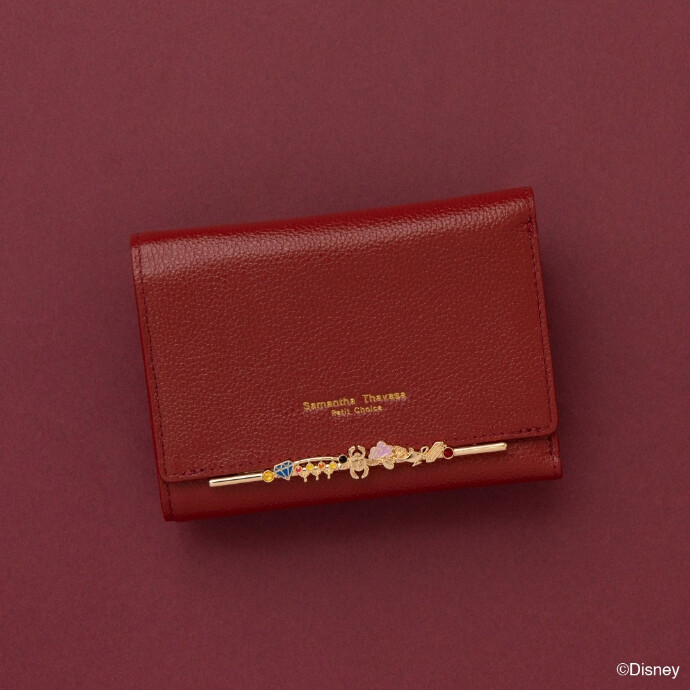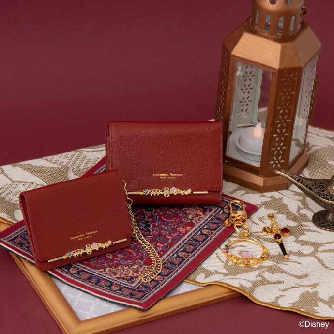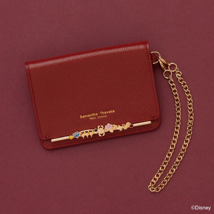 『アラジン』の世界観からインスパイアされ、砂漠の魔術師の熟慮の精神に基づき、思慮深く、知略に優れた生徒が多く在籍している寮。魔法のランプや宝石、寮生が身につけている装飾品をイメージした金具に、「スカラビア寮」のイメージカラーである深みのあるレッドのレザーを合わせた、財布、パスケース、のラインナップ。お揃いのキーリングも。