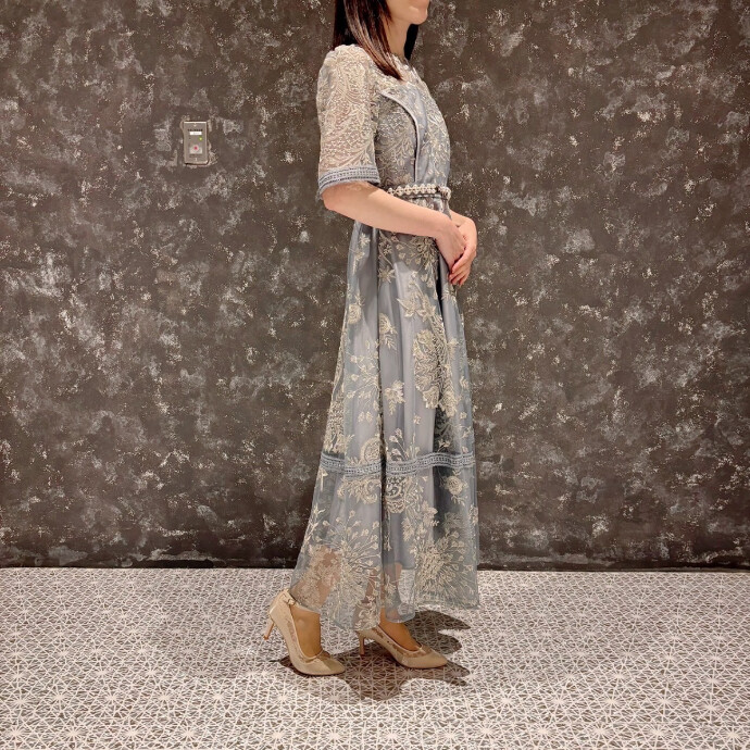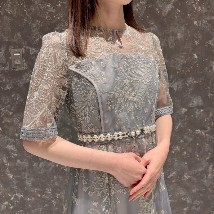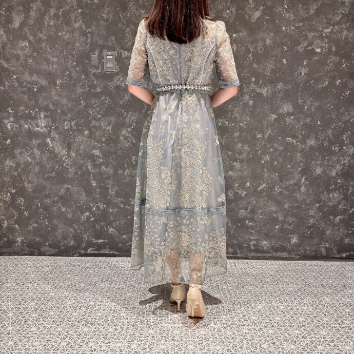 長めの袖丈は二の腕カバーにもなりますよ✨膝下から裾に向かって透け感があり足元を軽やかに綺麗に見せてくれます☺️