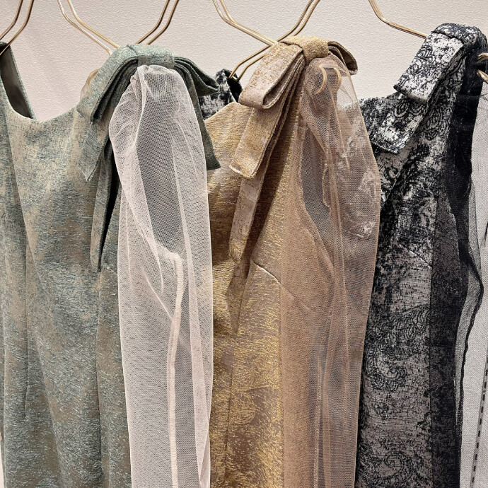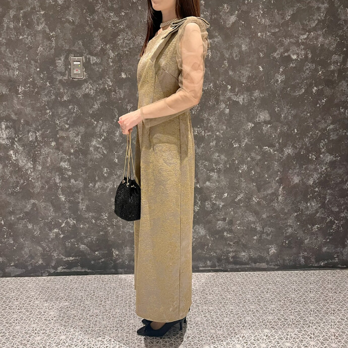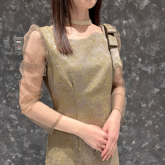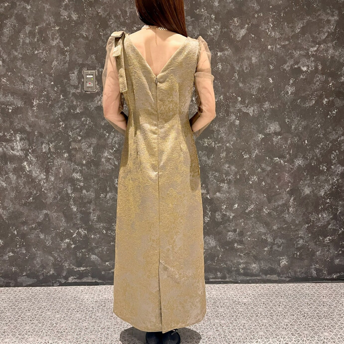 パーティードレスでは珍しいジャガード生地、きちんと感と落ち着いた雰囲気を出しつつも立体的な刺繍が存在感あるドレスです。