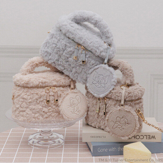 トムはグレー、ジェリーはベージュ、タフィーはピンクのもこもこのファーで表現したバニティバッグ。付属のミラーにはそれぞれの刺繍をポイントに魅力たっぷりに仕上げました。