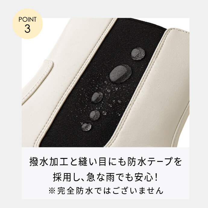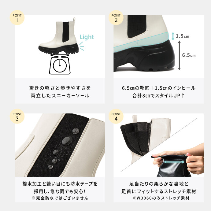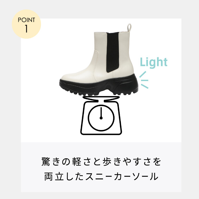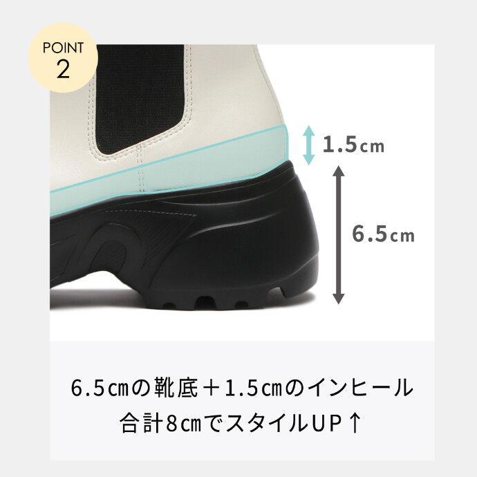 ー雑誌LEE監修ースタイリスト高橋美帆さん・ABC-MARTとのトリプルコラボモデル第二弾~機能満載スニーカーブーツ~王道のBLACKと抜け感満載のWHITEの2色展開。内側ファスナーで着脱のしやすさの強化しました。【軽量スニーカーソール】ボリューム感をだしつつ軽量ソールで快適な履き心地を実現【晴雨兼用】撥水加工仕様で急な雨も安心。【厚底+インヒール】スタイルUPを叶えるスニーカーソールは6.5cm。1.5cmのインヒール搭載。履いた瞬間ふわっと感じる柔らかいインソールは蒸れやすいブーツに合わせた抗菌消臭機能付き。【足あたり柔らか素材】内側は柔らかなジャージ素材を搭載。アッパーはシボ感とリッチな光沢でレザーのような質感を表現し、きちんと見えと快適さを両立。