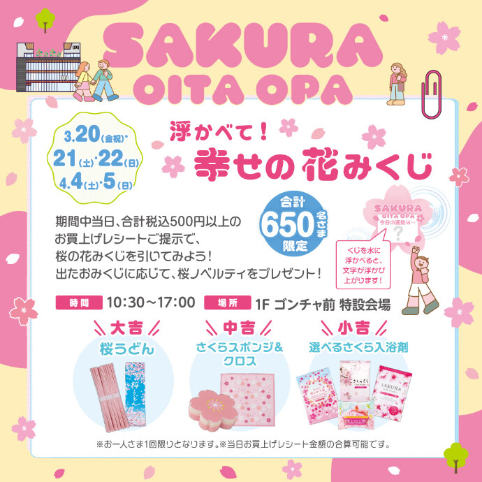 3/20(金祝)~22(日)、4/4(土)、5(日)の期間中当日、合計税込500円以上のお買上げレシートご提示で、桜の花みくじを引いてみよう!