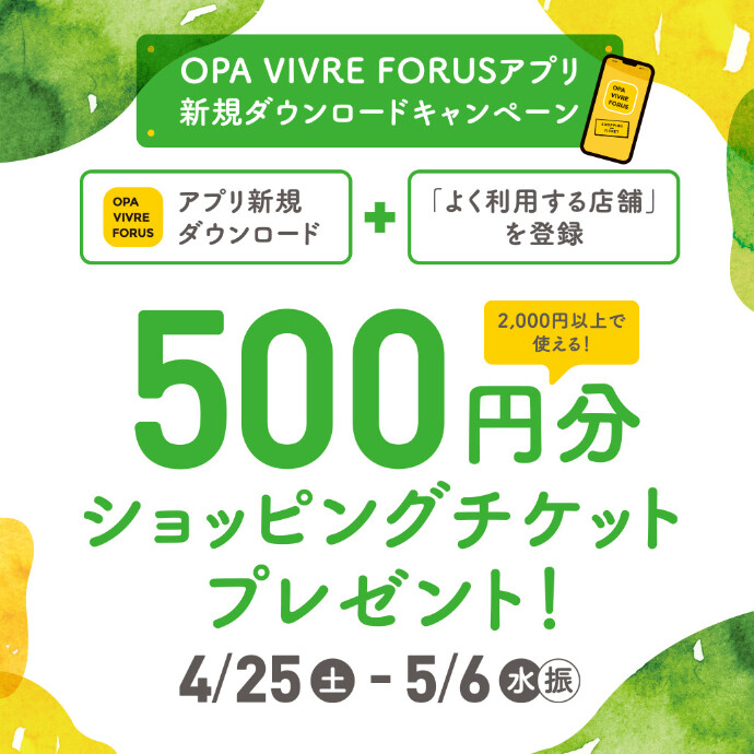 4/25(土)~5/6(水休)の期間中、アプリを新規ダウンロードで500円分ショッピングチケットプレゼント!