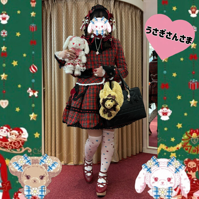赤タータンチェックのセットアップが冬にぴったりなうさぎさんさま❤️