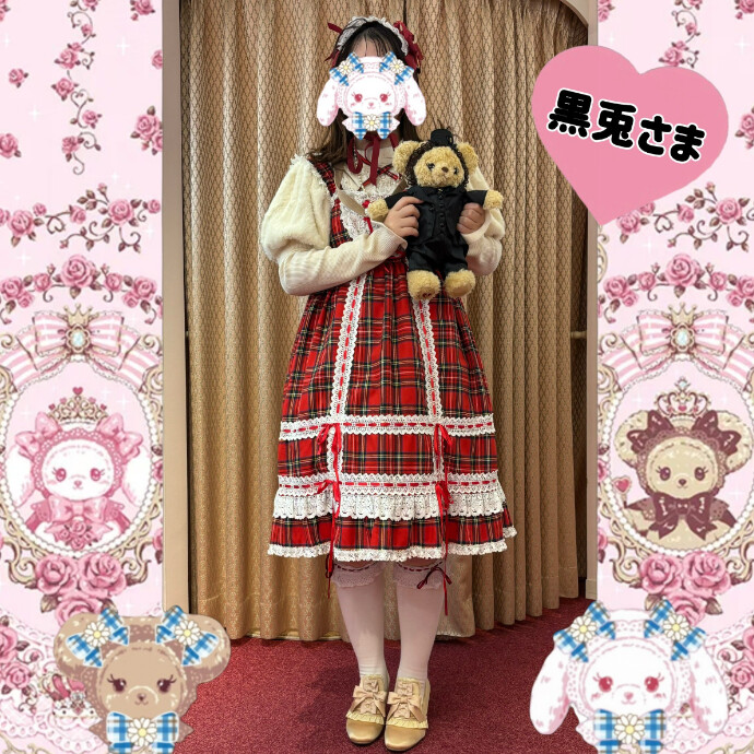 赤いタータンチェックのベビードールジャンパースカートで紅白カラーの黒兎さま💓