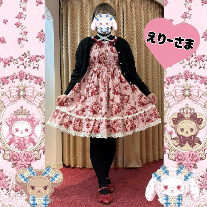いちごムースのシュガーブーケ柄に黒をあわせた黒×ピンクコーデなところが個性あふれるすてきなコーデくみゃ✨