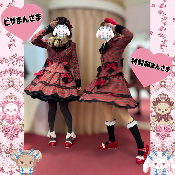 赤タータンチェックでふたごコーデの、ピザまんさま&特製豚まんさま💓