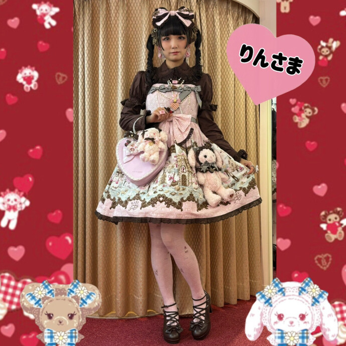 いちごチョコカラーのWelcome to the Sweets Hexenhaus♪柄シリーズに同色のうさくみゃちゃんがとってもかわいい甘々コーデのりんさま🍓