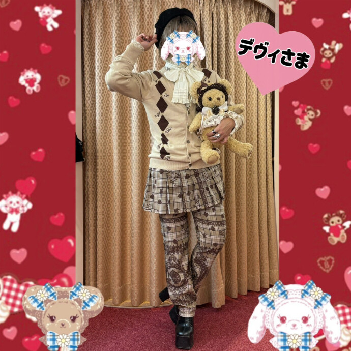 アリスのトランプレースタータン柄のパンツにカーディガンや、くまくみゃちゃんのお色がぴったりくみゃ🧸