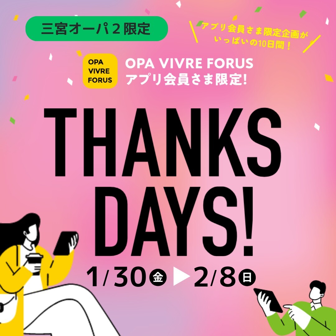 アプリTHANKS DAYSの期間中に、 OPA VIVRE FORUSアプリを新規ダウンロード&三宮オーパ2をお気に入り登録をしていただくと、税込2,000円以上で使えるショッピングチケット500円分をもれなくプレゼント! 期間: 1/30(金)~2/8(日) ショッピングチケットのプレゼントは、期間中の新規ダウンロードのみ対象です。 新規ダウンロード・アプリについて詳しくはこちら! https://www.opa-club.com/contents/app/ ※ショッピングチケットは、お気に入り登録後自動的に進呈されます。マイページの「クーポン」からご確認いただけます。ご利用の際はアプリマイページの「お買い物マイル」からお使いいただけます。 ※ショッピングチケットは、税込2,000円ごとに1枚ご利用いただけます。 ※ショッピングチケットの有効期限は、2026年2月20日(金)です。 ※ショッピングチケットは全国のオーパ・ビブレ・フォーラス(名古屋mozoオーパを除く)でご利用いただけます。 ※500円分のショッピングチケットのプレゼントはお一人さま1回限りとなります。公平なサービス提供のため、アプリの再ダウンロードによる特典取得はお控えください。不正利用が確認された場合、特典の無効化やアカウント制限を行う場合がございます。 ※ショッピングチケットのプレゼントは、期間中にアプリをダウンロードいただいた方のみが対象です。 期間外にダウンロードされた場合はショッピングチケットの発券はございませんので、予めご了承ください。 ※一部ご利用いただけないショップがございます。 【アプリマイル付与・ショッピングチケット対象外ショップ】 3F:買取専門店 大吉、コインスペース 4F:占いの店 東明館、カプセルラボ 5F:プリマート/カプセルラボ 8F:東明学院、ママスクエア、ドデカクッキースタジオ 9F:コインスペース ※その他期間限定出店ショップも対象外とします。