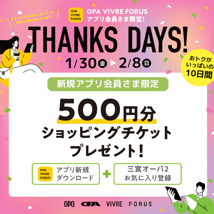 アプリ会員さまだけにお得な特典満載な10日間!限定ショップクーポンやマイル2倍など、三宮オーパ2を”お気に入り登録”して、お買い物をお楽しみください✨