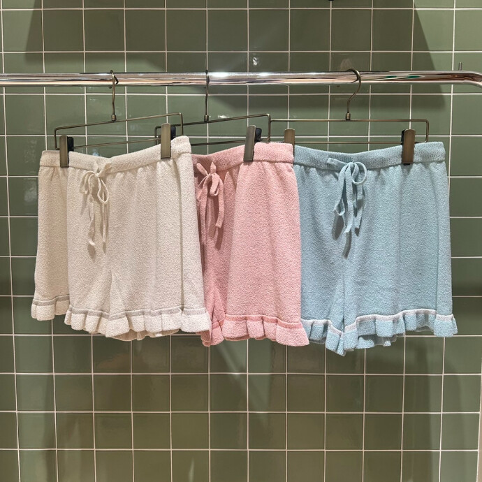 ラメ入りニットで作った、裾フリル付きのガーリーなショートパンツです。