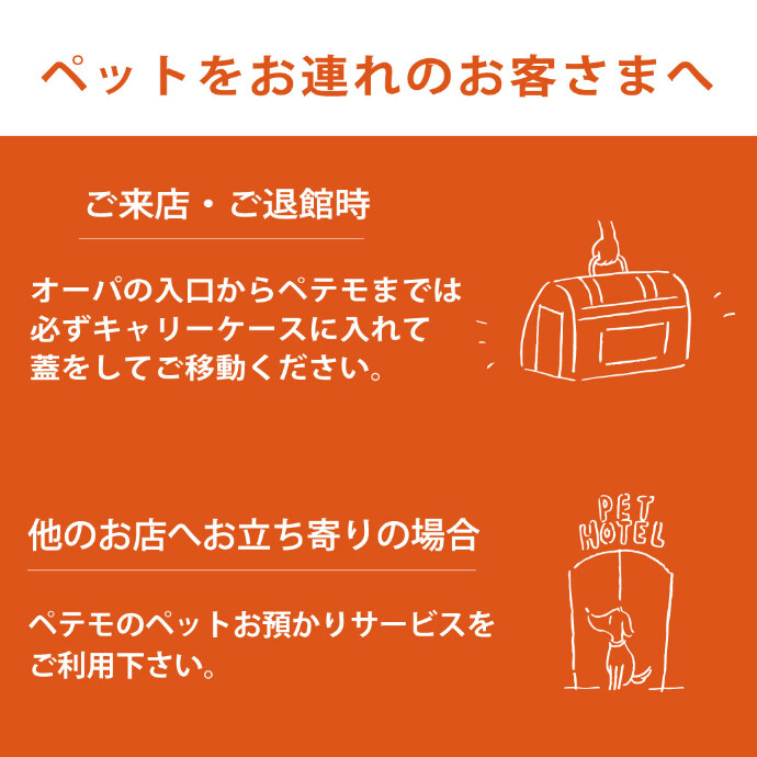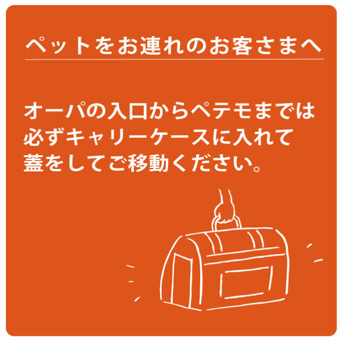5F ペテモへ、ペットを連れてご来店される際は、必ずキャリングケースに入れて蓋をしてご来店ください。