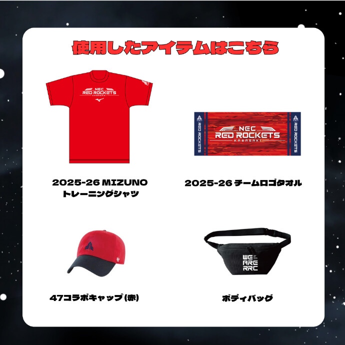 コーディネートに使用した「NECレッドロケッツ川崎」のオリジナルグッズをご紹介いたします。
