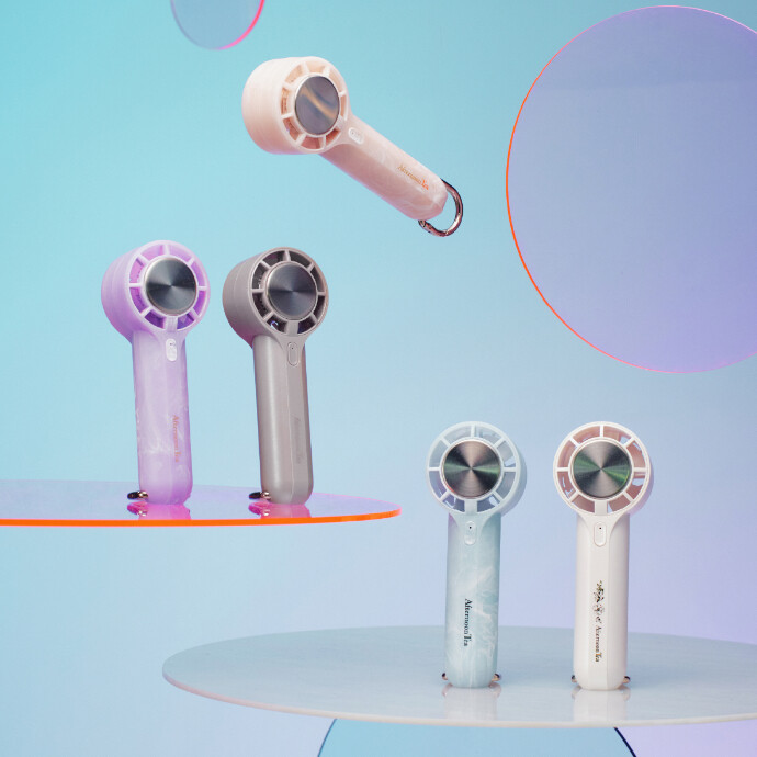 パールやグラデーションカラーがきらめく新デザインに加え、心地よいひんやり感をもたらすアイスプレート付きタイプや、カラビナでバックに付けられる新型のチャーム風ファンもラインアップ。