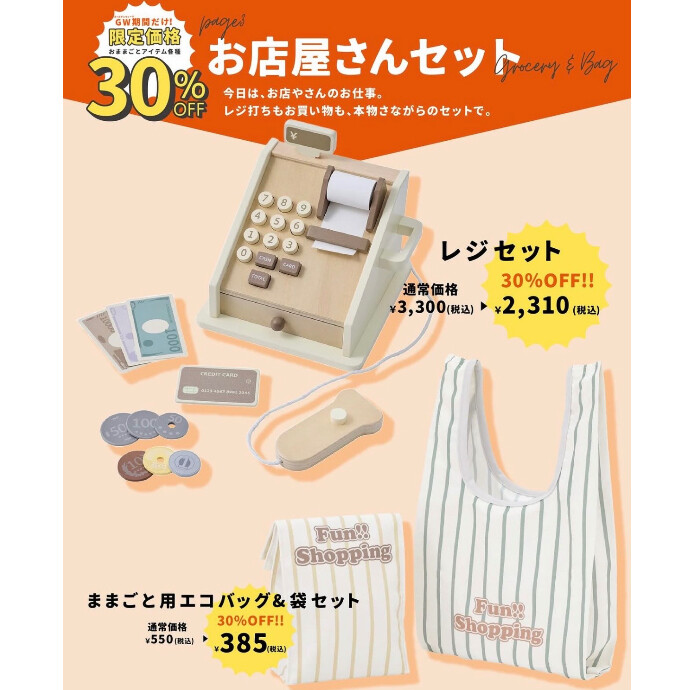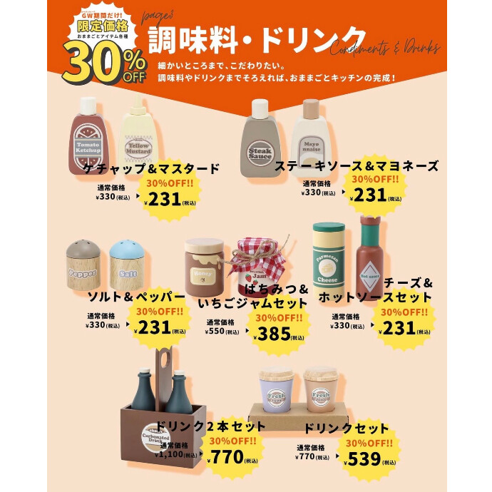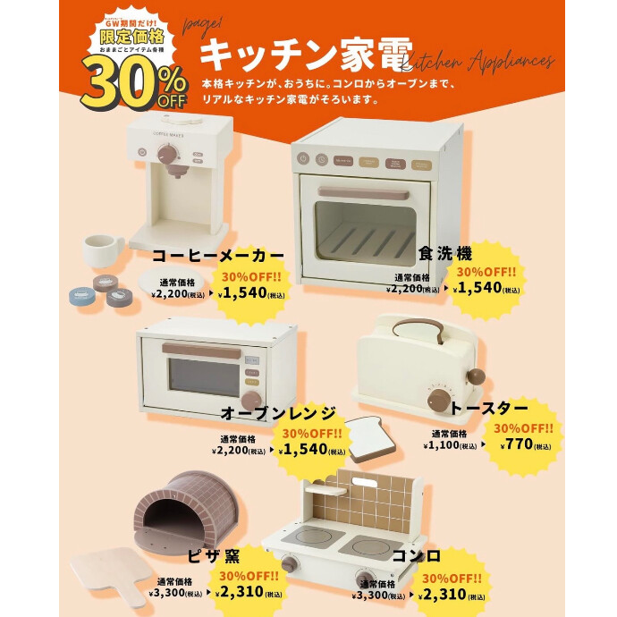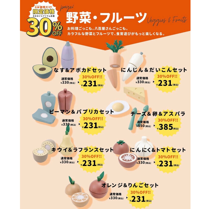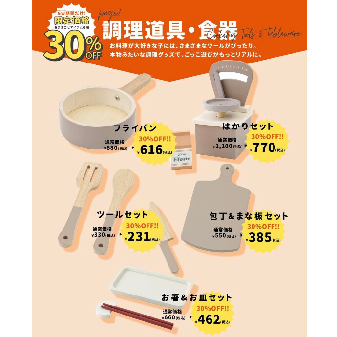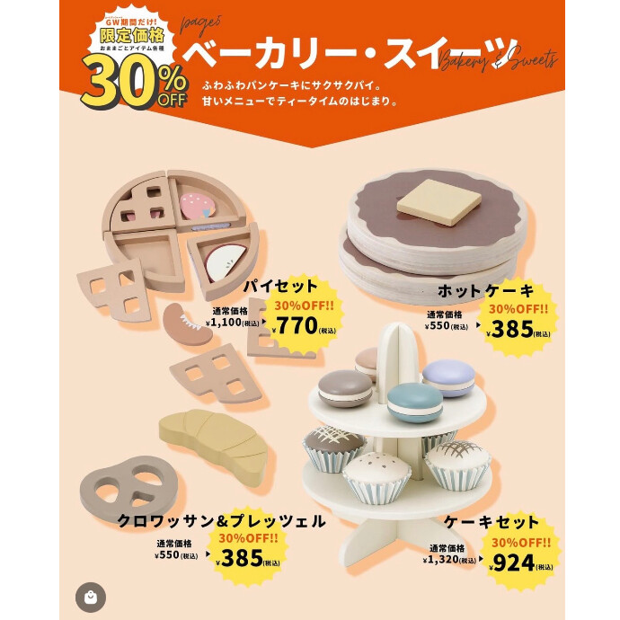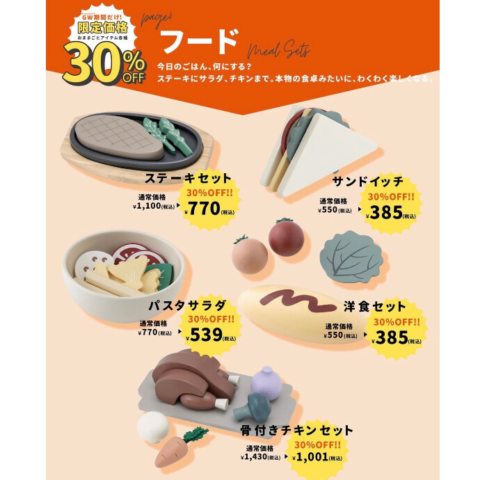 あたたかみのある木製に、淡いくすみカラーがかわいい「おままごとシリーズ』が30%OFFとお買い得‼️