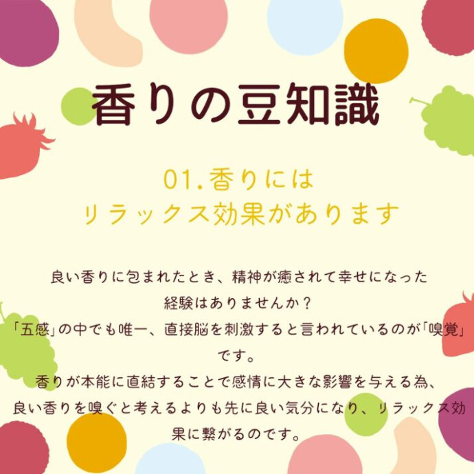 - オレンジ: シトラスの香りが全体を包み込み、明るく新鮮な印象を与えます。