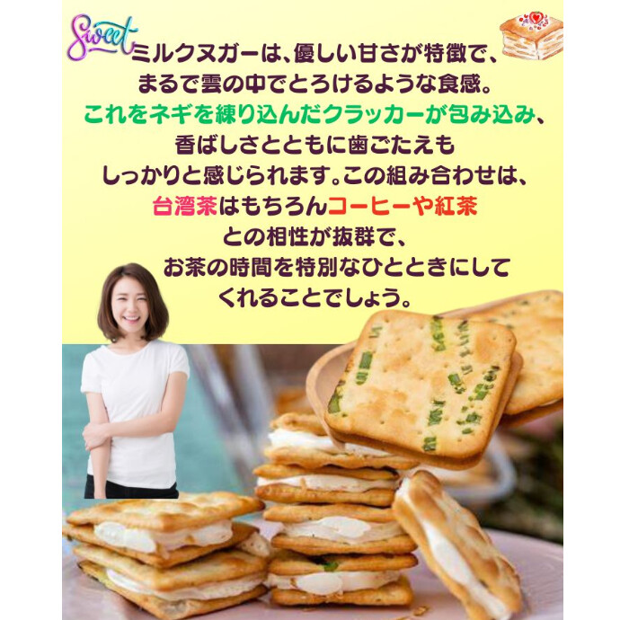 濃厚でしっとりしたミルクヌガーをサクサクのネギクラッカーでサンドしたお菓子。