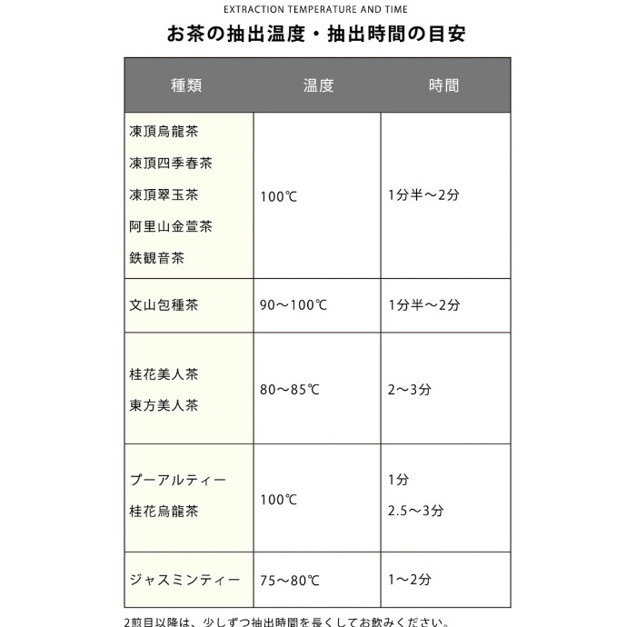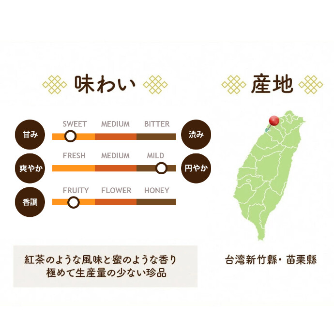 苗栗縣・新竹縣一帯で大切に栽培され、芯を含む3枚の葉だけを手摘みして作られるこだわりの一品です。