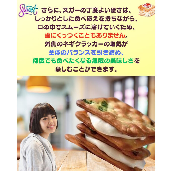 ミルクヌガーの優しい甘さとネギクラッカーの甘じょっぱさがクセになる美味しさ。