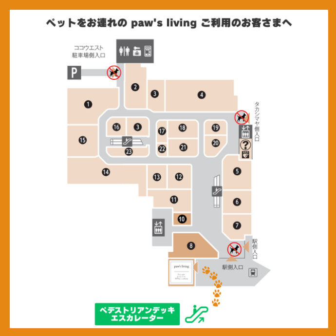 当館は「2F paw's living」を除く全館で、ペットのご同伴はご遠慮いただいております。