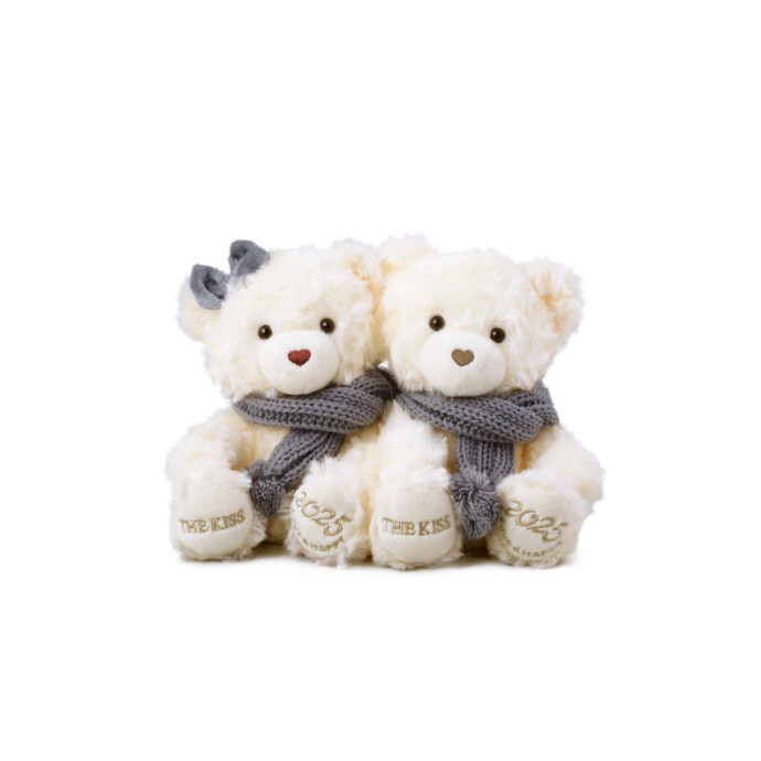 THE KISSのオリジナルベアLOVEとHAPPYがシックなグレーカラーのマフラーをつけた冬らしい装いで登場。