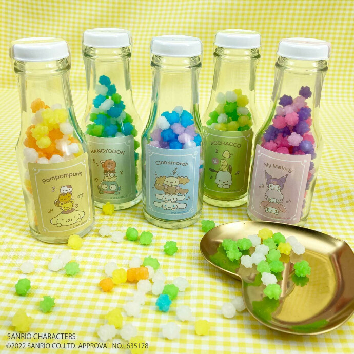 人気の『マイメロディ』『ハンギョドン』『ポチャッコ』『シナモロール』『ポムポムプリン』とお友達キャラがたてに重なったキュートなパッケージデザイン❣宝石のようにキラキラと輝く金平糖のほんのりとした甘さに癒されます🥰