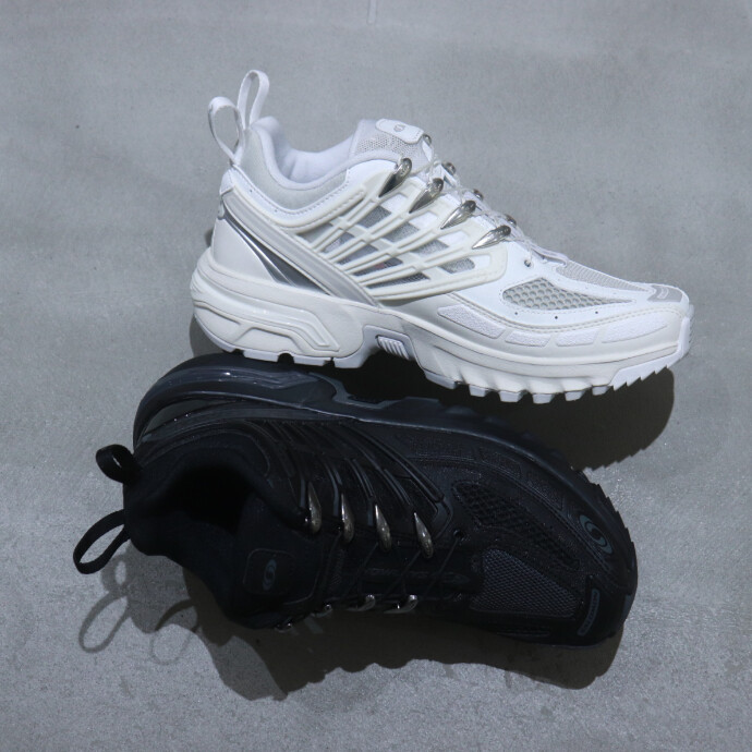 メッシュのデザインと存在感あるソールが目を引く一足。
