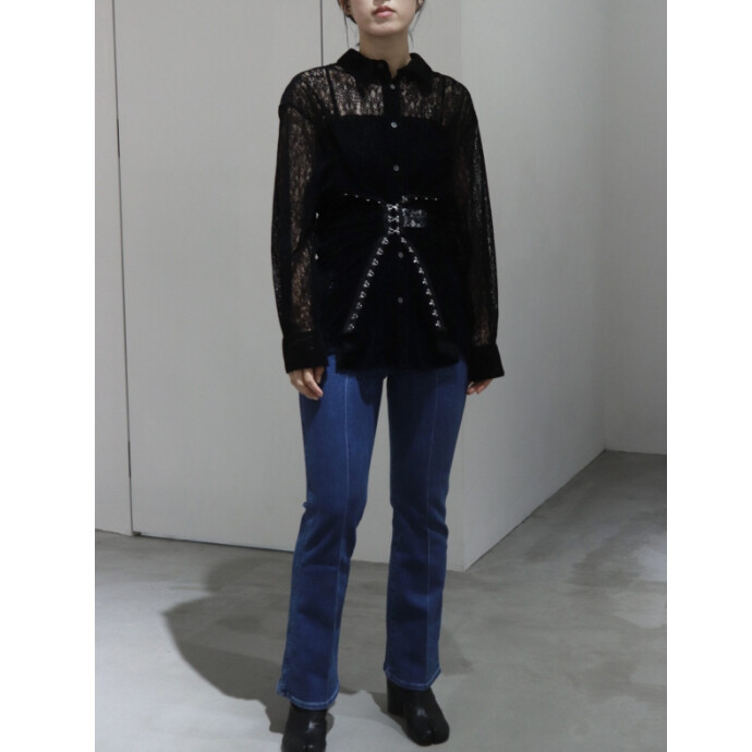 繊細なレースが印象的なChika Kisada / Race Shirtsに、すっきりとしたシルエットのMame Kurogouchi / Stretch Cropped Flare Jeans 、足元にMaison Margiela / Tabi Bootを合わせたスタイル。