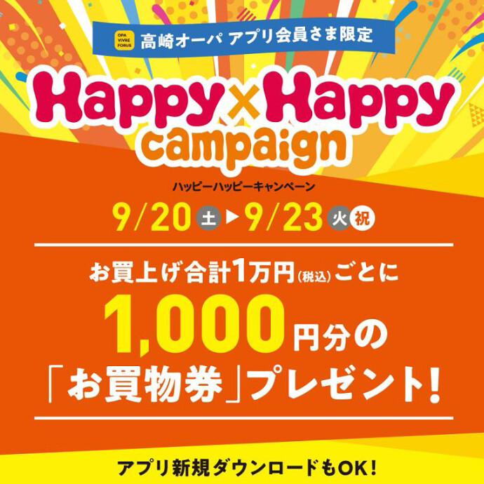 また、9/20(土)~9/23(火祝) の期間、高崎オーパにて「ハッピーハッピーキャンペーン」を開催。オーパアプリ会員様限定でお得にご利用いただけます。当日登録も可能。この機会にぜひご参加ください。