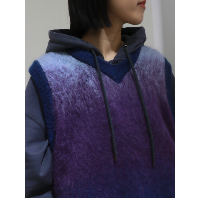 グラデーションが目を惹くニットベストは、厚めの肉感と肌触りの良さが魅力の一枚。