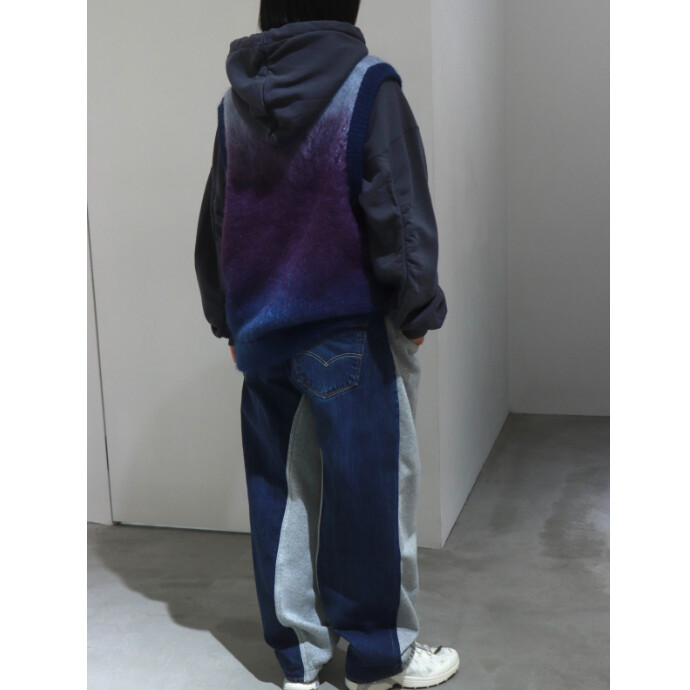 ボトムにはBLESS定番のジョガーパンツとデニムがドッキングされたパンツを合わせ、ユニークさをプラス。