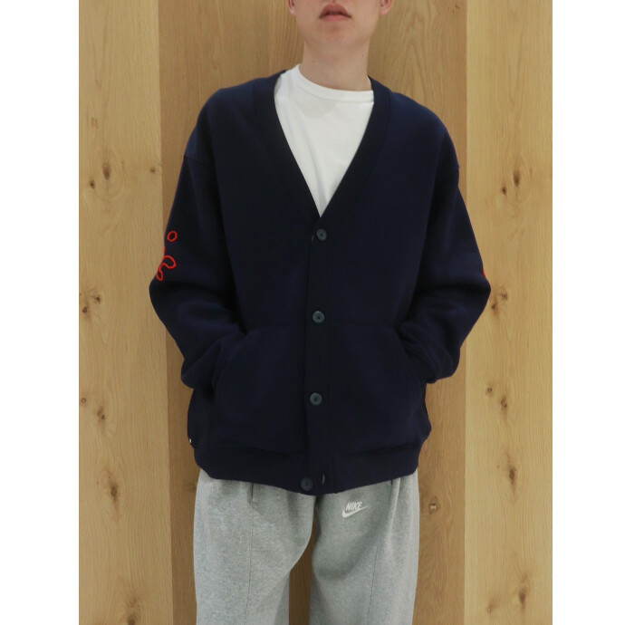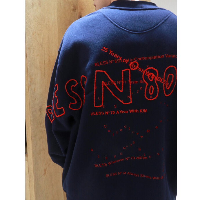 BLESSの「REFLEXIC MULTICOLLECTION SWEAT JACKET」は、ネイビーのボディに赤い刺繍ロゴがアクセントになったスウェットジャケット。