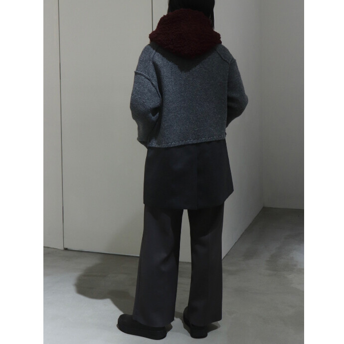 ボリュームのあるトップスに対して、タイトなシルエットが特徴のアムンゼンフレアパンツを合わせすっきりとした雰囲気に。