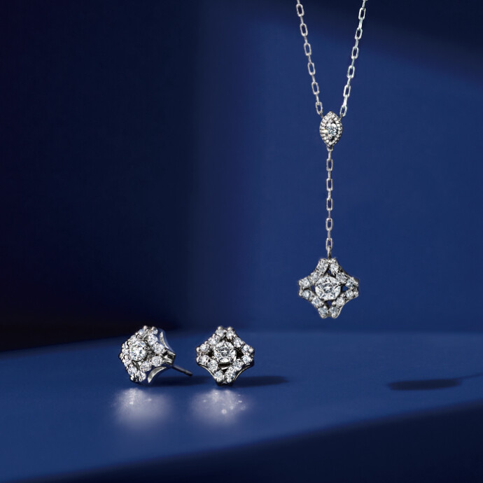 立体感のあるトップが、動きの中で光を受けてダイヤモンドが瑞々しく輝き、胸元の縦長シルエットがスタイリッシュでモダンな印象を作り出します★