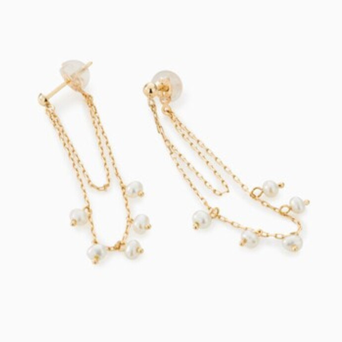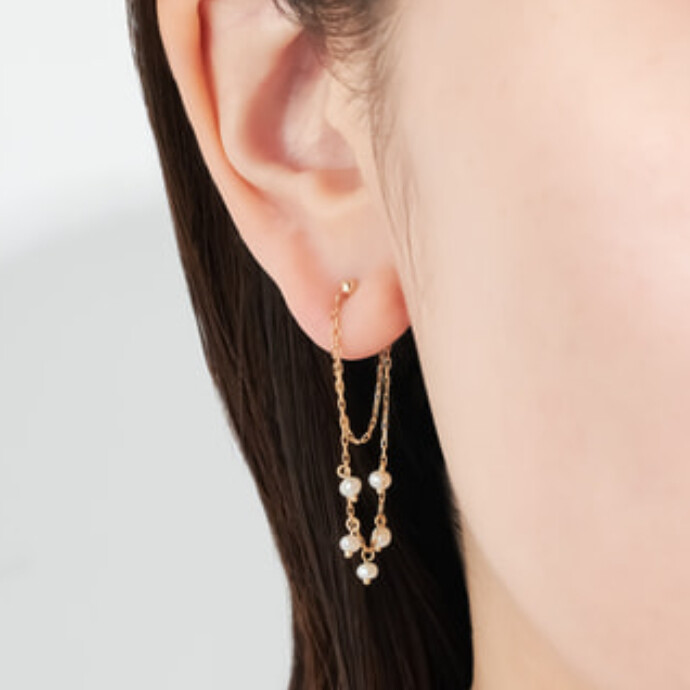 耳の下でドレープのようにチェーンが揺れるデザイン。